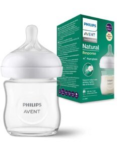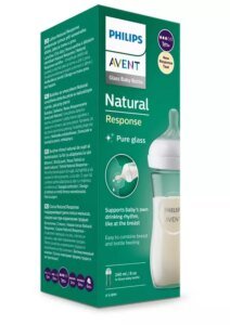 Biberon en verre haute qualité 240ml avec tétine Natural Response. Idéal pour l’alternance sein/biberon car le lait ne coule pas tout seul (anti-goutte).
