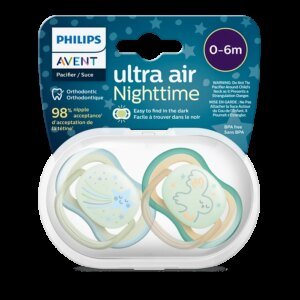 Sucette Ultra Air collection spéciale. Aérations extra-larges. Acceptee par 98% des bébés. Fournie avec boîtier de stérilisation.