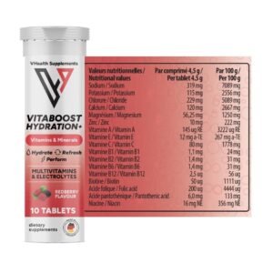 Découvrez les Comprimés Effervescents VHealth Vitaboost Hydratation+ au Goût Fruits rouge, le secret d’une vitalité retrouvée. Ce n’est pas une simple boisson, c’est un concentré d’actifs qui se dissout instantanément dans l’eau pour vous offrir une hydratation supérieure et un regain d’énergie.