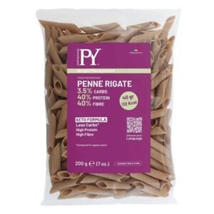 Format: 200 GNouvelles pâtes Penne Rigate de la marque PastaYoung spécialement adaptées au régime cétogène, régime protéiné, régime lowcarb… Avec une recette faible en glucides seulement 3,5% riches en fibres 40% et riche en protéines 40%. Formule KETO 40% de protéines 40% de fibres 3,5% de Glucides (Carbohydrates)