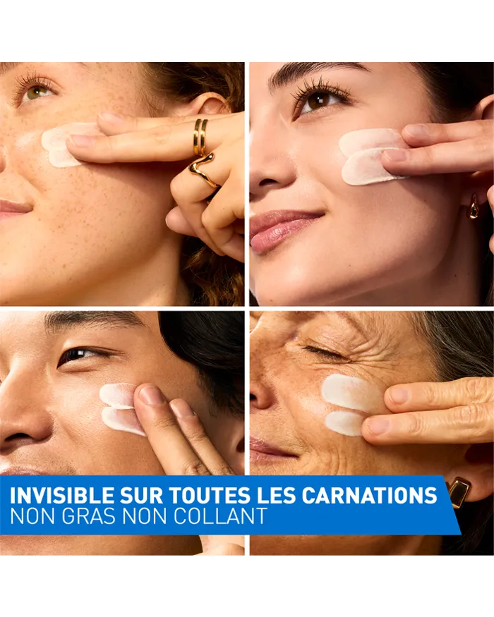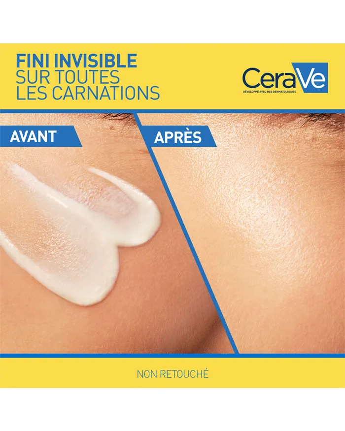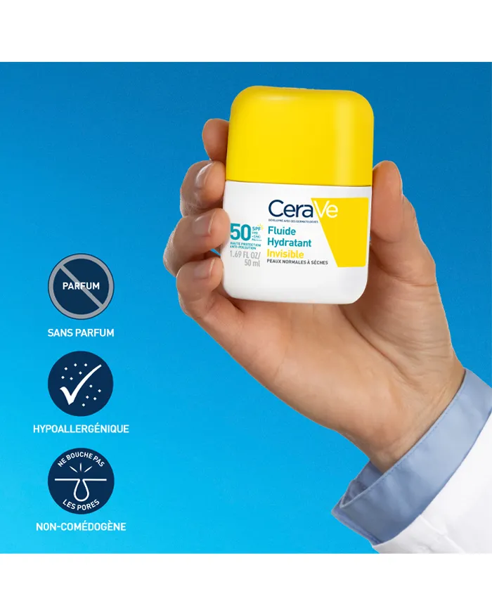 Le Fluide Hydratant Invisible SPF50 CeraVe est une protection solaire haute performance spécialement conçue pour les peaux normales à sèches, même sensibles. Sa formule légère au fini invisible hydrate pendant 24 heures grâce à la Technologie MVE, tout en bloquant les rayons UVA, UVB et UVA longs. Enrichi aux 3 céramides essentiels et à la vitamine E antioxydante, il prévient le photovieillissement, les taches brunes et protège de la pollution. Testé sous contrôle ophtalmologique. Sans traces blanches sur toutes les carnations. Sans parfum. Sans alcool.